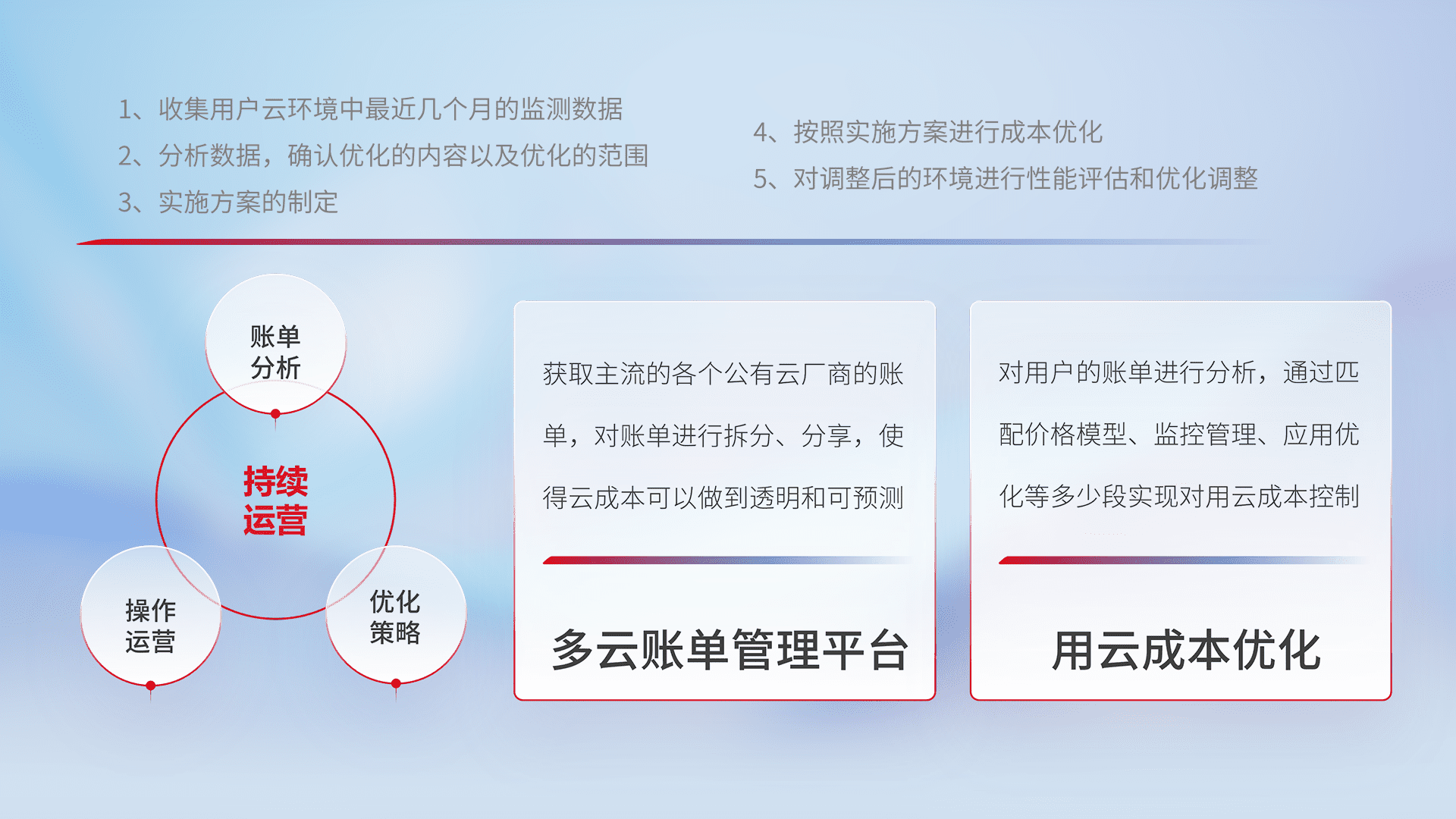 通过多云纳管,,,以统一的资源数据模型把客户的云资源进行抽象和封装,,进而实现对多云资源的统一操作,,,,保障云资源管理的可靠性、、稳定性与可用性。。。。量身定制化运维内容,,,配置、、、、开发运维、、、、补丁管理、、、备份、、、监控、、、、认证和访问管理、、、审计和日常巡检等,,保障在用云过程中的可靠度,,稳定度以及高可用率。。